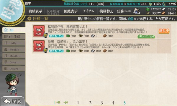 艦これ 2月5日 松輸送作戦 継続実施せよ 任務完了 艦これ日記 白羊の記録紙